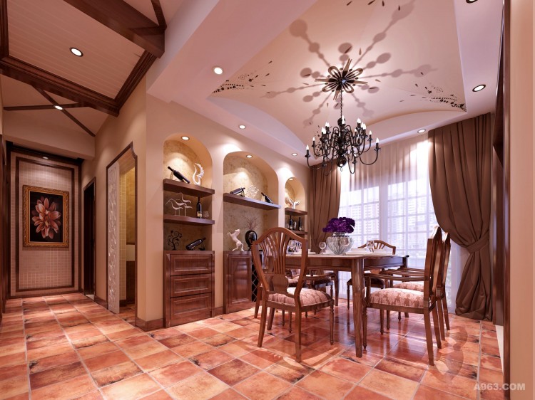 2. 餐厅相对于家居的其他场所,更应力求空气流畅环境整洁。不可放置太多的装饰品。而软装饰较适合餐厅的布置。清新、优雅的布艺制品,尤其是较薄的化纤类材料为好选择。因为厚实的棉纺类织物极易吸附食物气味且不易散去,不利于餐厅的环境卫生。