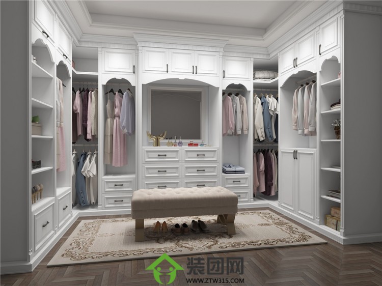 优点:不仅仅是储存衣物、鞋子包括相应的功能区。并且可以融入梳妆台、穿衣镜等,完全把整个空间独立起来,是女生的最佳理想空间。